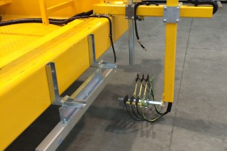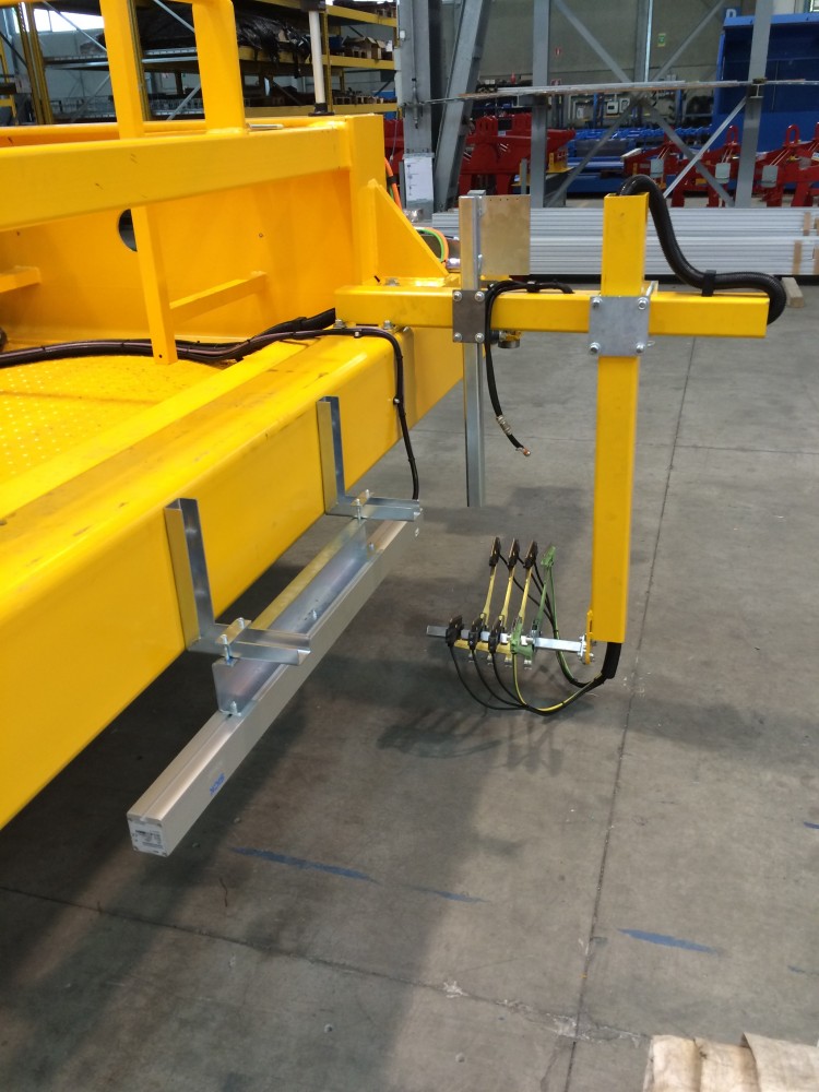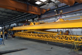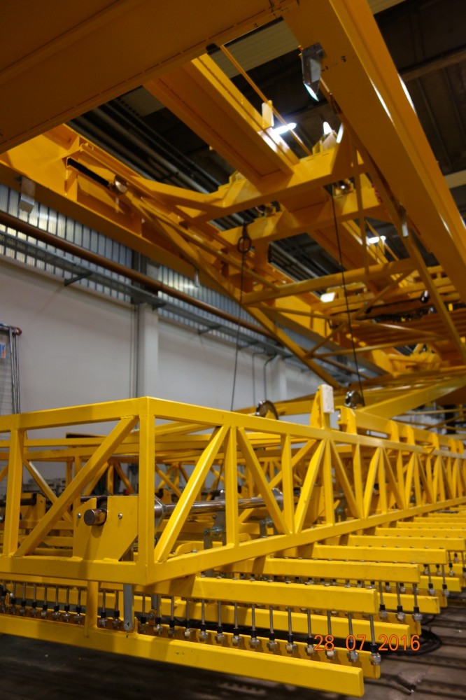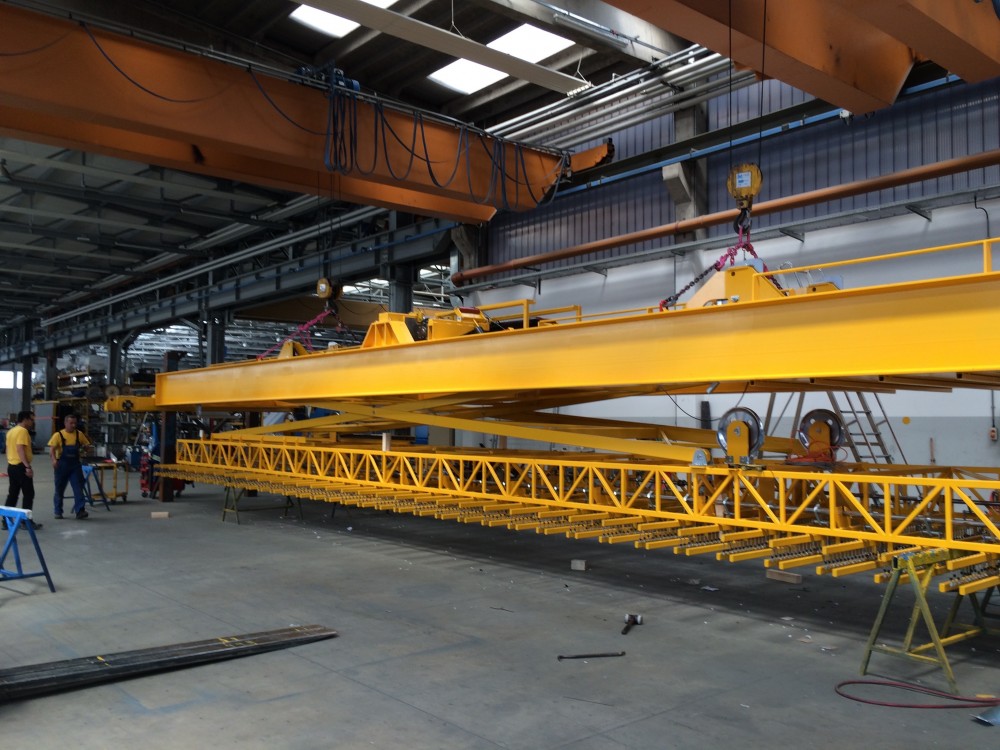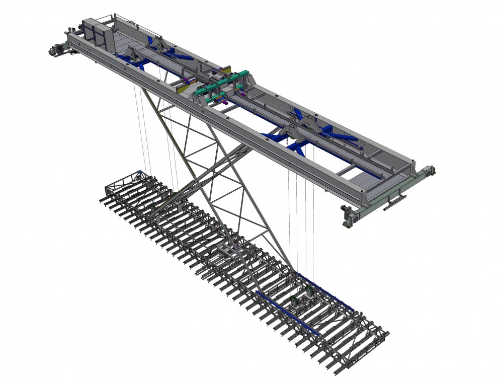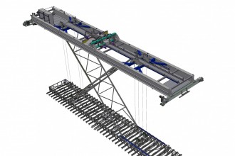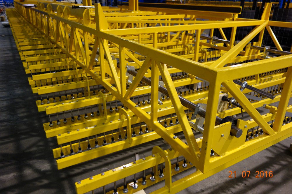 Carroponte per il trasporto di reti elettrosaldate 16 x 3 m con sistema di sollevamento a magneti permanenti.